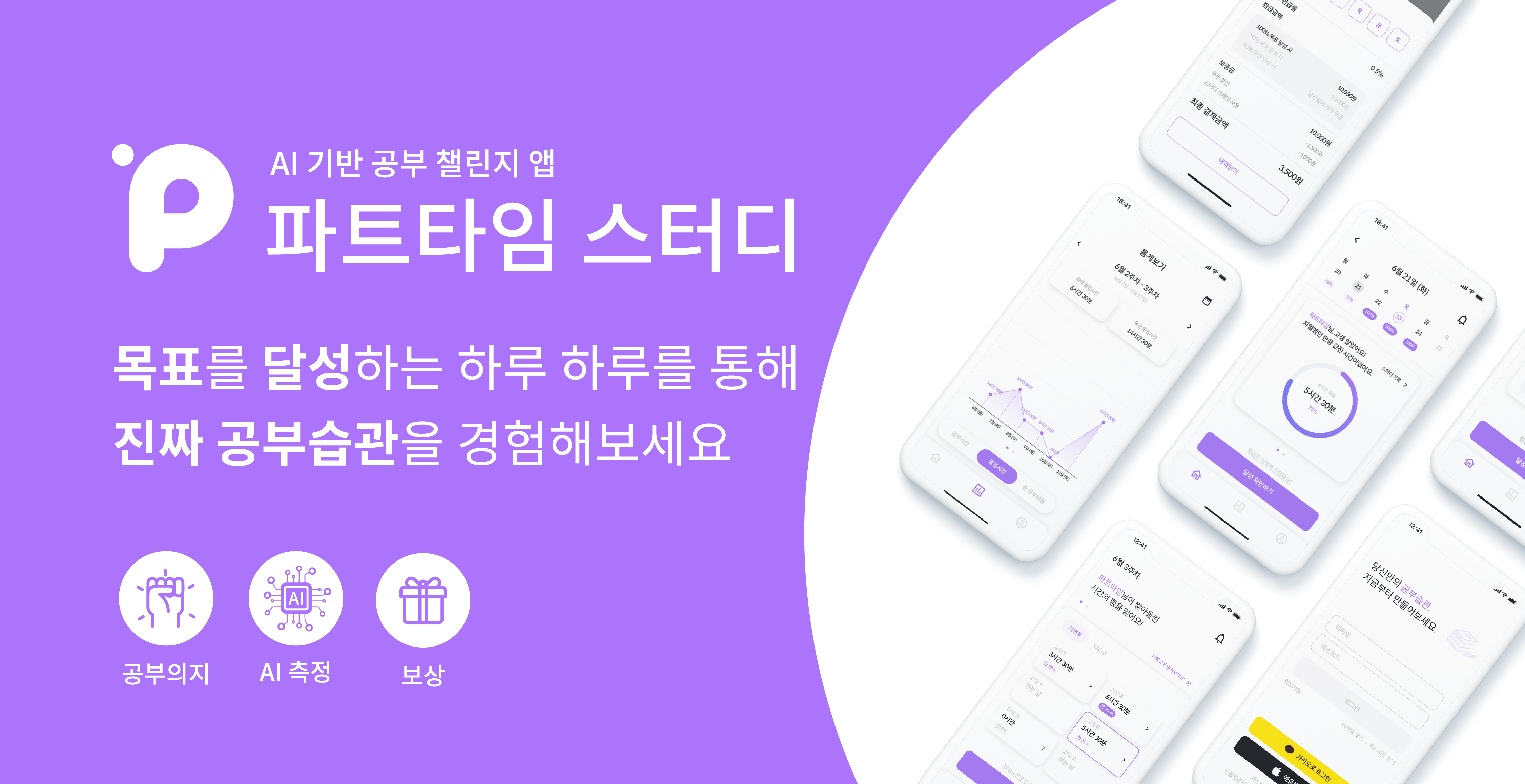 파트타임 스터디는 비전 AI 기술을 바탕으로 공부 챌린지를 제공하는 앱 서비스이다. 이용자가 스마트폰 앱 카메라로 공부하는 모습을 촬영하며 목표한 공부시간을 달성하는 챌린지 방식이다. 촬영되는 공부영상은 AI의 분석을 거쳐, 순수하게 공부한 시간만이 측정된다.