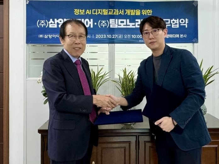 에듀테크 기업 (주)팀모노리스(대표 엄은상, 전종현)는 교육 출판 전문기업 (주)삼양미디어(대표 신재석)와 정보 AI 디지털교과서 플랫폼 개발을 위한 업무 협약을 체결했다고 22일 밝혔다.