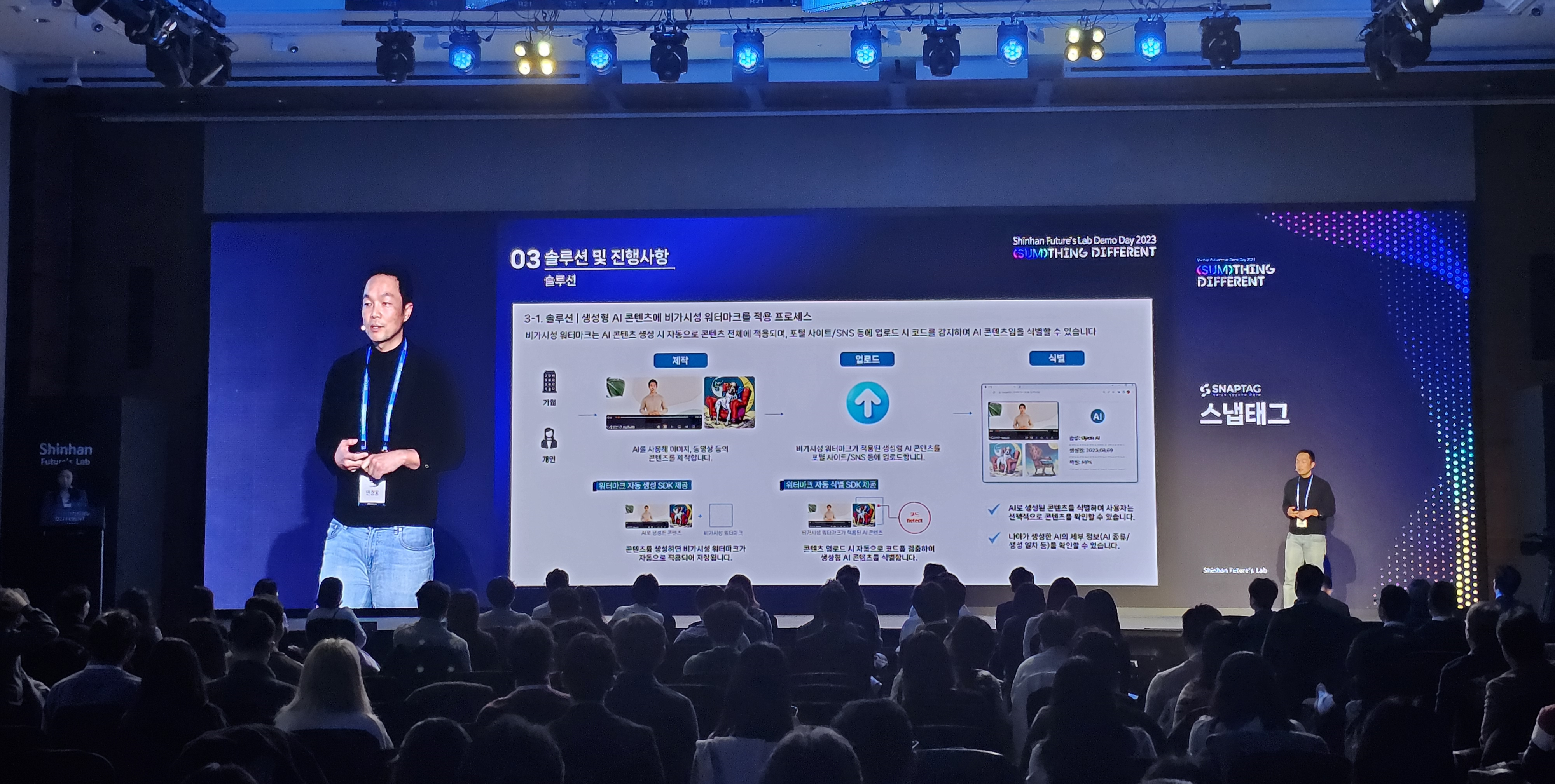 비가시성 워터마크 기술 기반의 IT 기업인 스냅태그가 지난 22일 여의도 콘래드 서울 호텔에서 열린 ‘2023 신한 퓨처스랩 데모데이’ 행사에 신한카드 협업 우수 사례로 선정되어 참가했다.