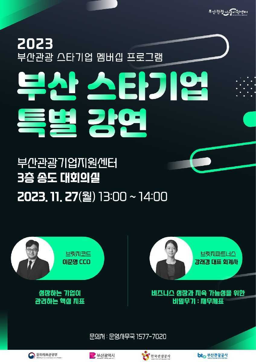 11월 27일 ‘2023 부산관광 스타기업 멤버십 프로그램’의 일환으로 부산관광기업지원센터에서 개최된 이번 부산 스타기업 특별 강연은 문화체육관광부, 부산광역시, 한국관광공사, 부산관광공사가 공동 주최했다. ‘성장하는 기업이 관리하는 핵심 지표’를 주제로 브릿지코드 이준명 CCO가 강연하고, ‘비즈니스 성장과 지속 가능성을 위한 비밀 무기 : 재무제표’를 주제로 브릿지파트너스 강래경 대표 회계사가 강연을 진행했다.