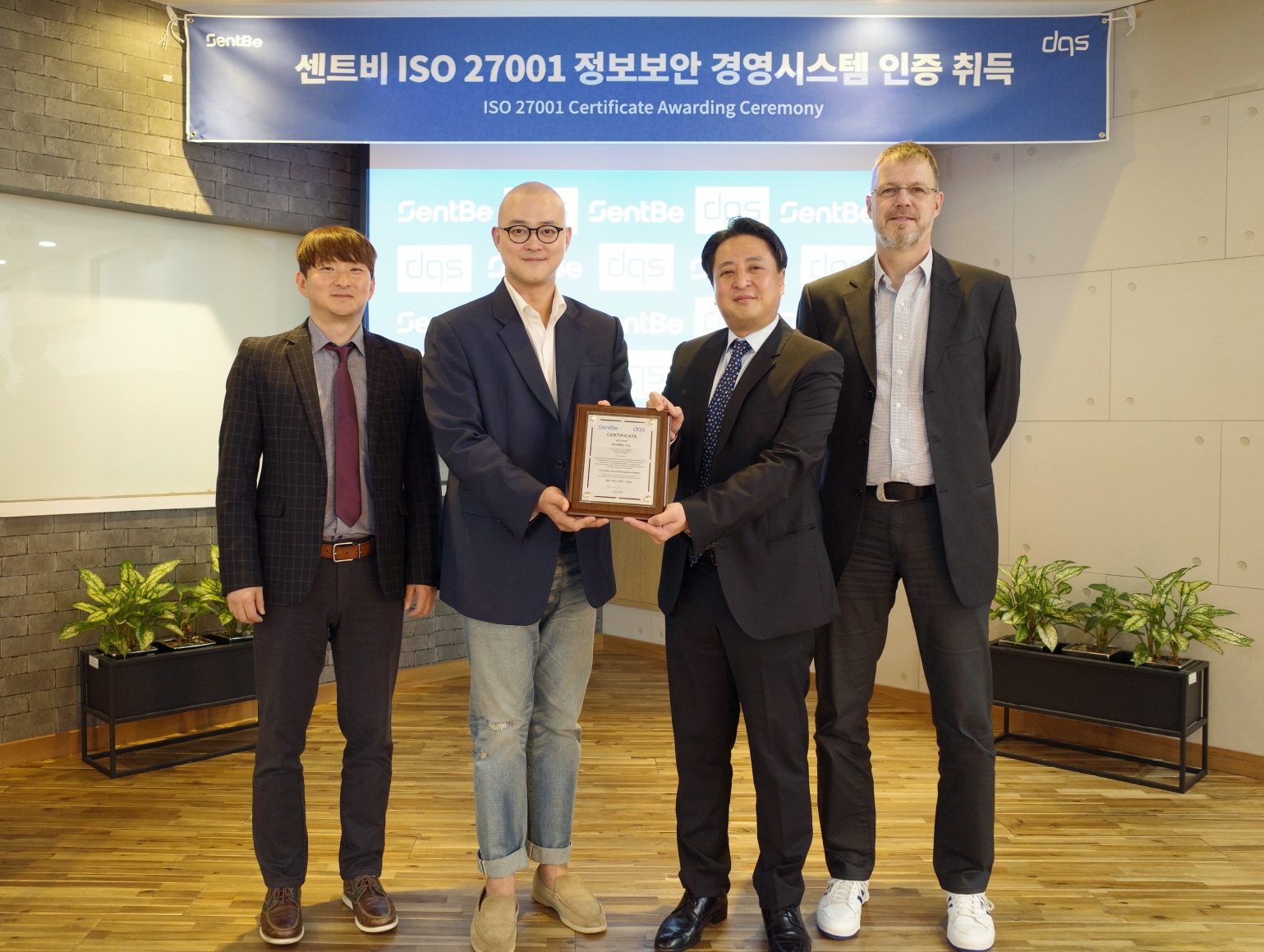 인증 수여식은 지난 27일 DQS코리아에서 진행됐으며 센트비 최성욱 대표, 최재필 CTO와 지신명 DQS코리아 대표, Ingo Unger DQS 인터내셔널 비즈니스 매니저 등이 참석했다.