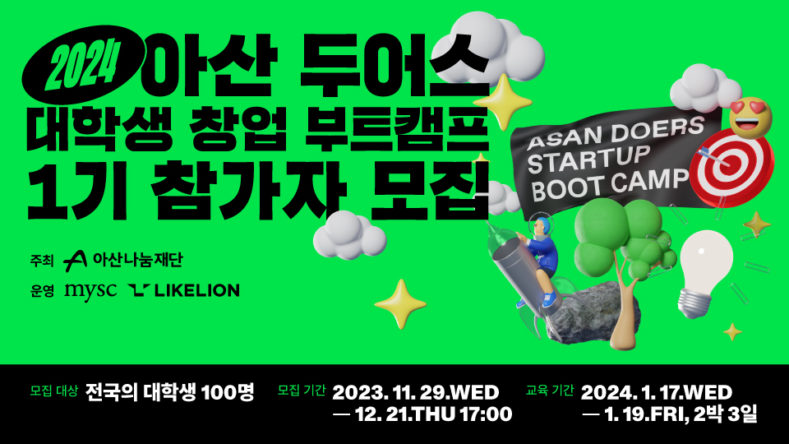 아산나눔재단(이사장 장석환)은 대학생들의 기업가정신 함양과 창업 교육을 위해 ‘2024 아산 두어스 대학생 창업 부트캠프’ 사업을 새롭게 전개하며 오는 29일부터 12월 21일까지 참가 대학생을 모집한다.