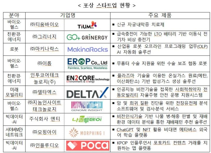 신산업 분야 딥테크 스타트업 중 올해 매출액, 투자실적, 고용 등에서 성과가 우수한 ㈜티움바이오 등 10개사를 선정하여 중소벤처기업부 장관 표창을 수여했다.