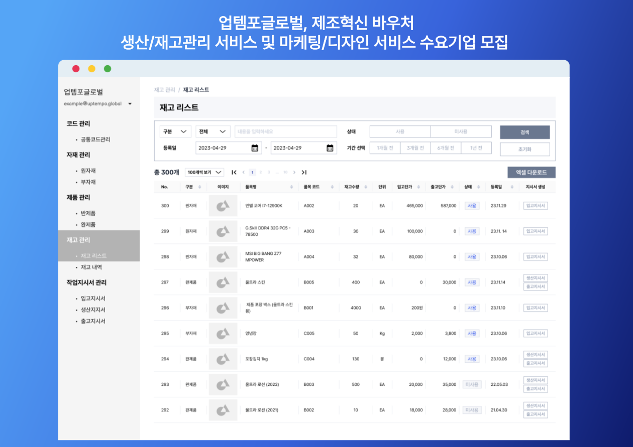 이번에 업템포가 선보이는 생산/재고관리 서비스는 수요기업별로 특화된 UI/UX 디자인 및 개발 커스터마이징이 가능하다. 부품, 소재, 의류, 식품, 화장품 등 다양한 제조업체를 위한 서비스이면서 기존의 복잡한 MES, ERP 솔루션과는 달리 누구나 쉽게 사용할 수 있도록 직관적으로 디자인되었다. 고객의 제조 환경과 요구에 맞게 맞춤형 서비스를 제공하고, RFID 기술을 활용한 빠르고 정확한 재고관리를 실현하는 것이 특징이다.