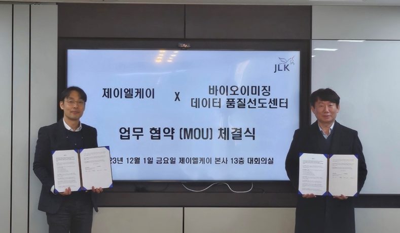 제이엘케이(대표 김동민)가 강남구 역삼동에 위치한 제이엘케이 사옥에서 바이오이미징 데이터 품질선도센터와 전략적 파트너십 구축 및 데이터 표준화를 위한 업무협약(MOU)을 체결했다고 4일 밝혔다.