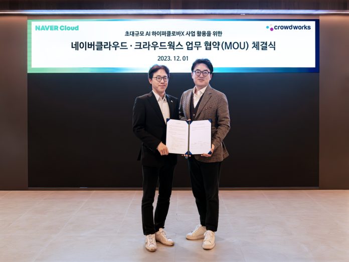 크라우드웍스는 지난 1일 네이버클라우드(대표 김유원)와 초대규모 언어모델 하이퍼클로바X의 B2B 서비스 사업 확대를 위한 기업 고객 발굴과 서비스 제공, 기술 요소 개발 등을 위한 비즈니스 협력 양해각서를 체결하는 행사를 가졌다.