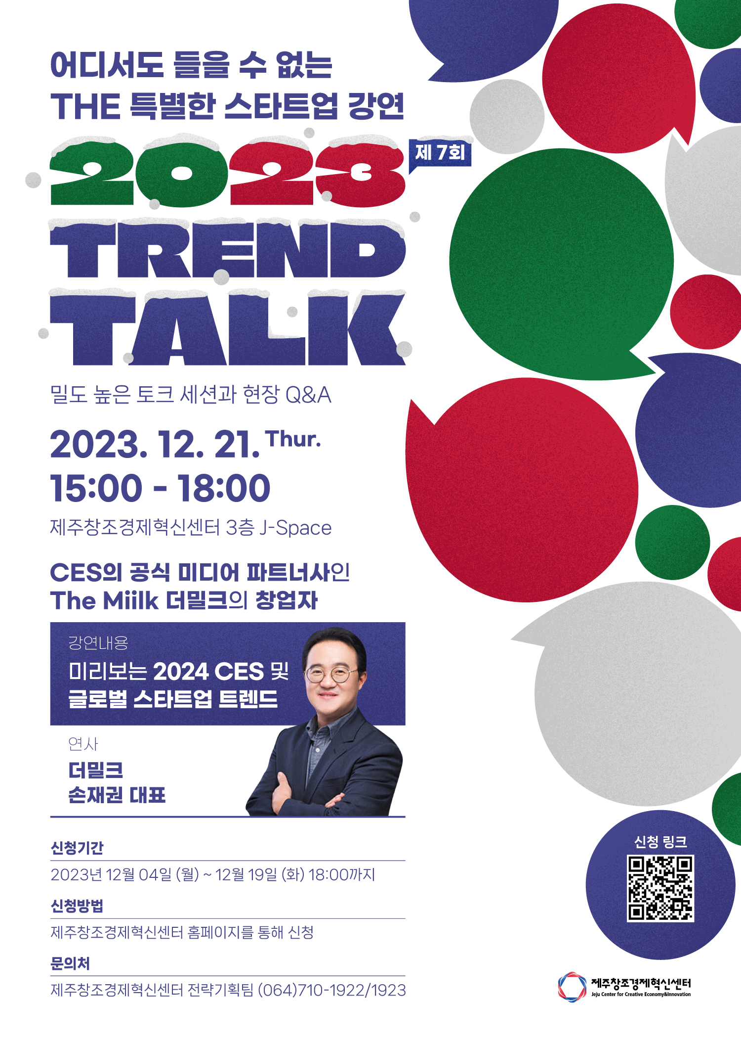 제주센터는 CES의 공식 미디어 파트너사인 더밀크 손재권 대표를 초청한 제7회 TREND TALK 를 오는 21일 오후 3시부터 제주벤처마루 3층 J-Space에서 진행한다.