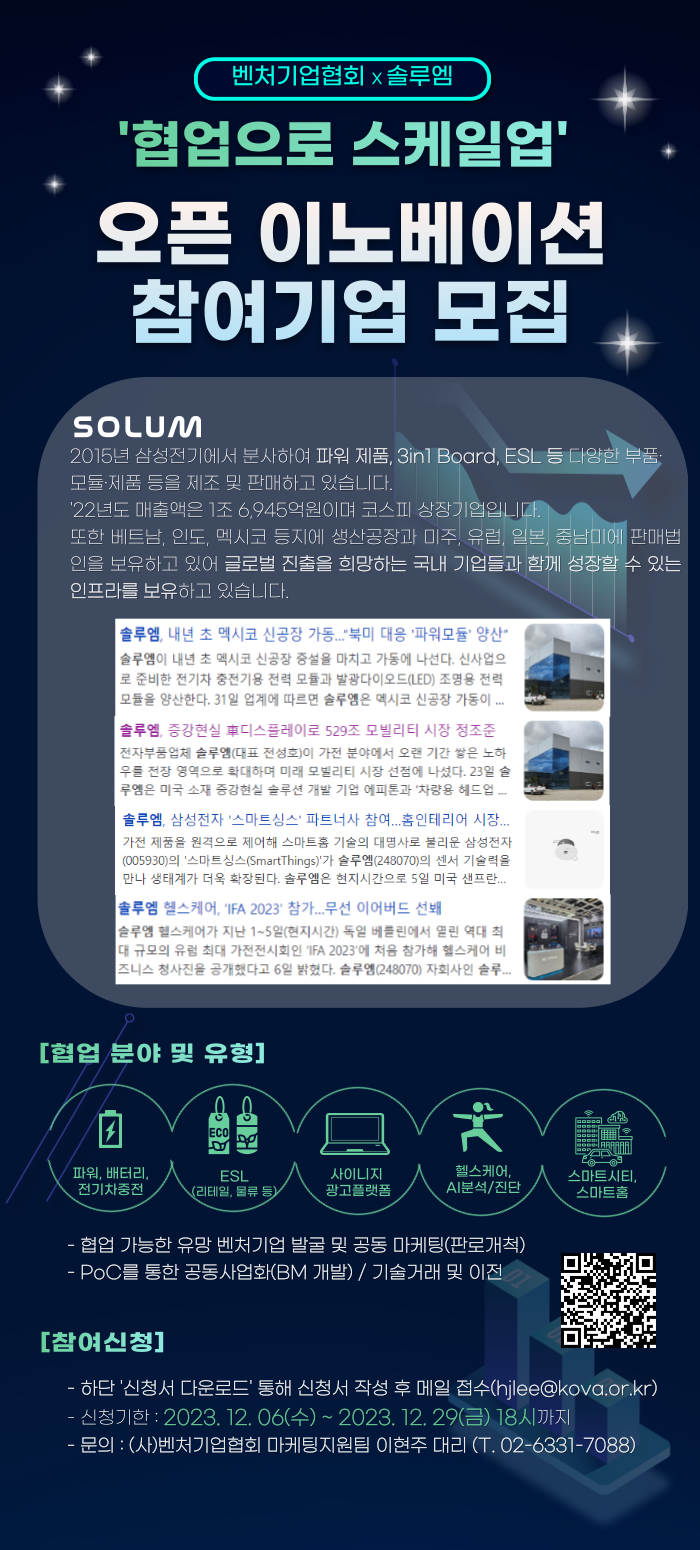 (사)벤처기업협회가 ㈜솔루엠과 오픈 이노베이션 희망 벤처기업을 12월 29일까지 모집한다.