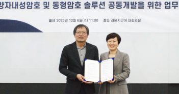 라온시큐어가 크립토랩과 손잡고 양자 보안 사업을 위한 제품과 서비스 개발을 추진한다. IT 보안·인증 선도기업 라온시큐어(대표 이순형)는 암호 기술 전문 기업 크립토랩과 양자내성암호(Post-Quantum Cryptography, PQC) 및 동형암호(Homomorphic Encryption, HE) 기반 신제품 및 서비스 상용화를 추진하기 위한 업무 협약(MOU)를 체결했다고 7일 발표했다. 크립토랩은 데이터를 암호화한 상태로 연산할 수 있는 동형암호 원천기술을 보유하고 암호 분야 100여 개의 특허를 등록한 기업이다. 서울대 수리과학부 교수인 크립토랩 천정희 대표는 암호 학계 발전에 기여한 점을 인정 받아 2023년 세계암호학회(IACR) 석학 회원에 선정된 바 있다. 이와 함께 미국 국가기술표준원(NIST)이 표준으로 채택한 양자내성 관련 암호체계인 '크리스탈-카이버(CRYSTALS-Kyber)'와 '크리스탈-딜리시움(CRYSTALS-Dilithium)'을 개발한 세계적인 양자내성암호 석학인 데미안 스텔레 프랑스 리옹 고등사범학교 교수가 지난 4월 연구 리더로 크립토랩에 합류했다. 라온시큐어는 양자내성암호 비즈니스를 위해 적극적인 연구개발을 진행하고 있으며, 크립토랩과의 업무 협약도 그 일환이다. 양자내성암호란 암호화된 데이터도 해독하는 양자컴퓨터의 공격에도 내성을 갖는 더욱 안전한 암호체계를 뜻하며, 이 기술은 차세대 보안 패러다임을 선도할 기술로 각광받고 있다. 이번 협약에 따라 세계적으로 인정받는 양자내성암호와 동형암호 기술을 보유한 크립토랩은 전산업에 걸쳐 탄탄한 시장 입지와 기술력이 입증된 보안 솔루션들을 보유한 라온시큐어와 함께 양자내성암호 및 동형암호 기반 신제품 및 서비스 개발에 상호협력하게 된다. 앞서 라온시큐어는 지난 10월 COEX에서 개최한 '2023 시큐업 세미나'에서 자사 보안 솔루션의 양자내성암호 적용 로드맵을 발표한 바 있다. IT 보안 분야에서의 리더십을 양자내성암호 분야에서도 이어간다는 계획이다. 라온시큐어 이정아 사장은 “보안 솔루션 리더의 입지를 미래에도 탄탄히 하기 위해 연구개발에 투자를 아끼지 않고 있으며, 크립토랩과의 양자내성암호 상용화 협력을 통해 상호 역량을 교류하며 기술 교류 및 협업 시너지를 기대한다”며 “차세대 패러다임을 발빠르게 수용하고 앞서서 이끌며 국내는 물론 글로벌 시장에 'K-시큐리티'의 저력을 보여줄 것”이라고 말했다. 크립토랩 천정희 대표는 “글로벌 학계에서 인정한 크립토랩의 원천 기술을 활용해 오랜 시간 시장에서 신뢰 받는 라온시큐어와 함께 훨씬 더 강력해진 양자내성암호 및 동형암호 기반 보안 솔루션과 서비스들을 개발할 것”이라며 “이 제품들은 더 정교하고 고도화된 공격 기술들이 등장할 미래의 보안을 이끌 것으로 기대한다”고 말했다. 관련 기사 더 보기 https://www.venturesquare.net/905120