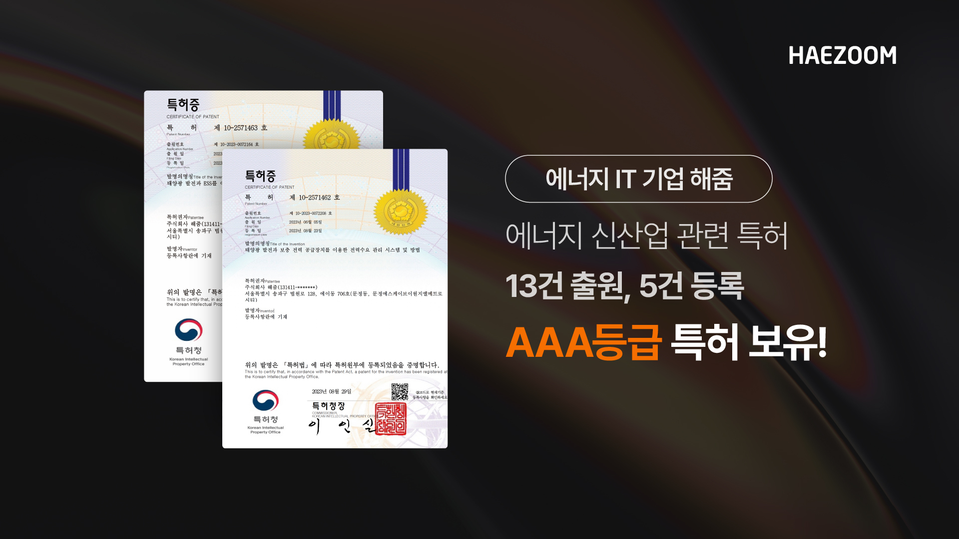 에너지 IT기업 해줌(Haezoom)이 지속적인 연구 개발을 통해 VPP(가상발전소), RE100, xEMS(맞춤형 에너지 관리 시스템) 사업과 관련 총 13개의 특허를 출원했다.