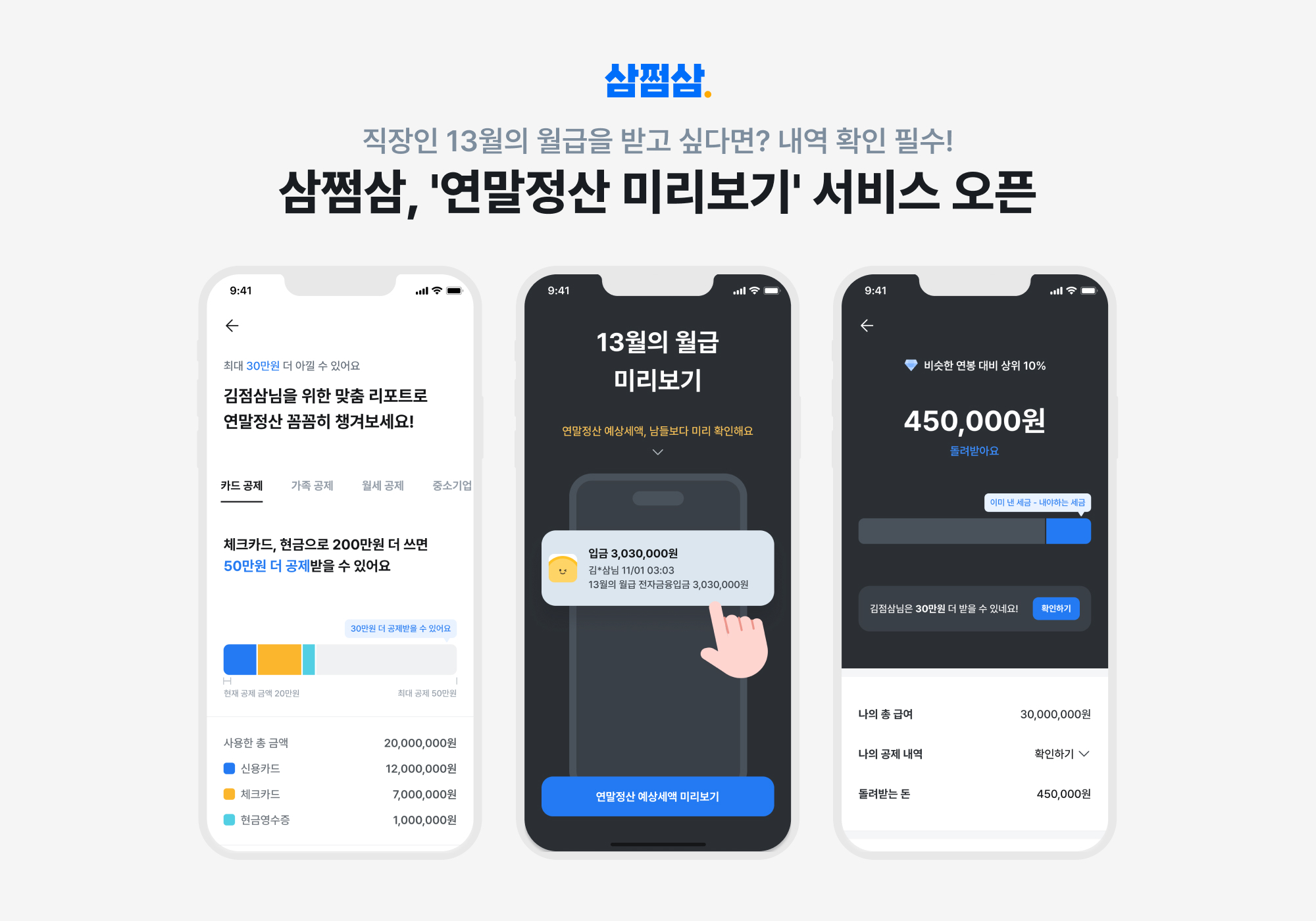 자비스앤빌런즈 선수빈 PM(Product Manager)은 “‘삼쩜삼 연말정산 미리보기’는 연말정산이 직장인에게 있어서 매우 중요한 연중행사임에도 불구하고 연말정산 기간이 되어서야 내역 확인을 해야 하는 불편함을 줄여보고자 시작하게 된 서비스”라며 “삼쩜삼 연말정산 미리보기 서비스를 통해 많은 고객이 더욱 간편하게 연말정산을 대비할 수 있길 바란다”고 전했다.