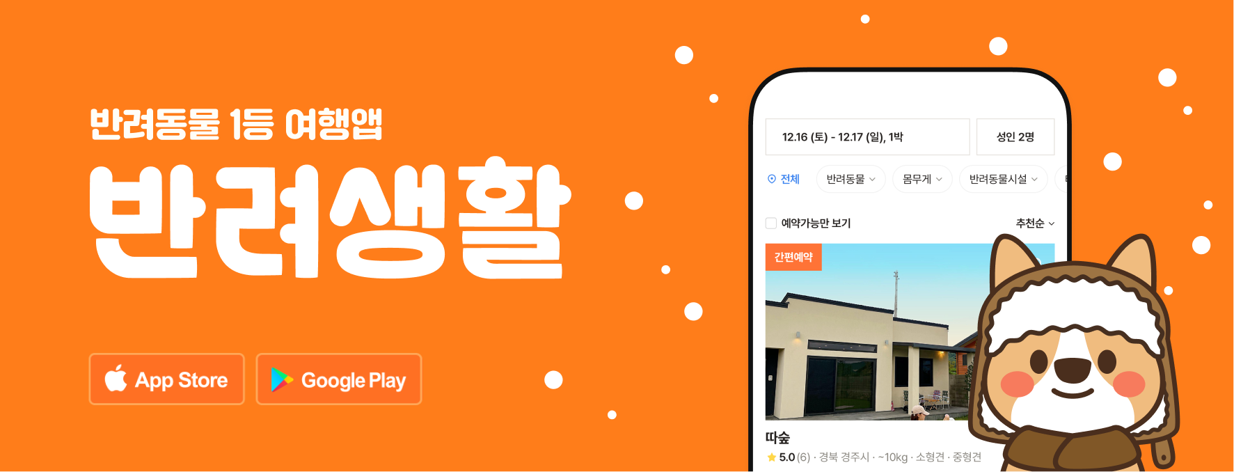 반려생활은 배달의민족 성장기를 이끈 멤버들이 모여 창업한 회사로 반려동물과의 여행 시, 검색의 어려움을 해소하기 위해 전국 약 20,000여개의 카페, 맛집, 여행지 검색 기능을 제공하고 있고 애견펜션, 캠핑, 글램핑, 애견동반호텔 등 여행 트렌드에 맞춘 다양한 숙소의 예약이 가능한 플랫폼이다.