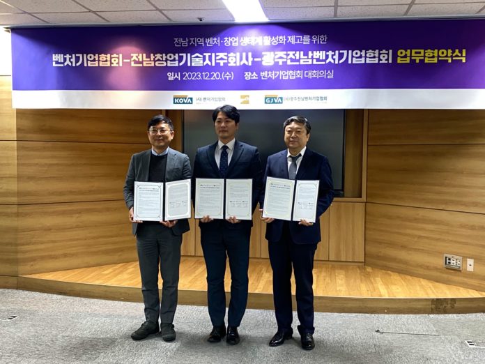 (사)벤처기업협회(회장 성상엽), 전남창업기술지주회사(대표 김재우), 광주전남벤처기업협회(회장 김명술)는 20일(수) 오전 전남지역 벤처·창업기업의 성장기반 마련과 벤처창업생태계 활성화를 위해 3자 업무협약을 체결했다.