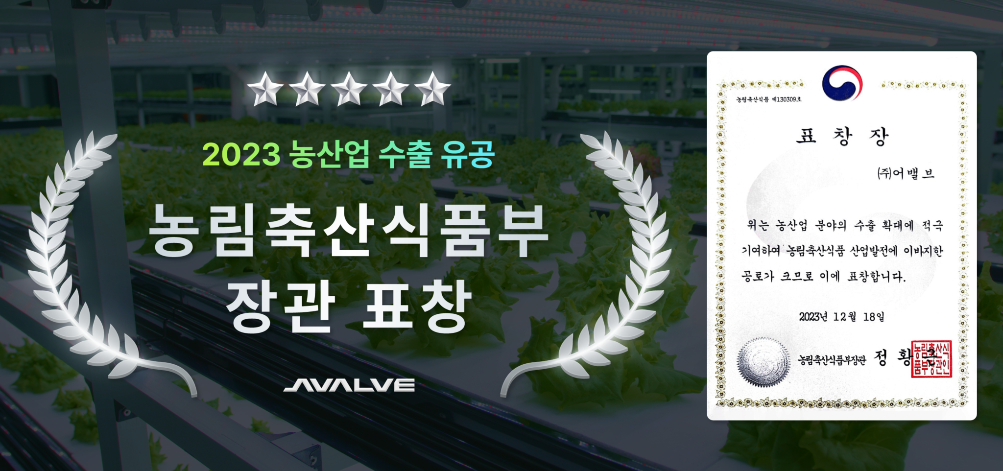어밸브가 18일, 2023 농산업 스마트팜 수출 분야에서 농림축산식품부 장관 표창장을 받았다. 이 표창은 농산업 분야의 스마트팜 기술 수출 확대에 적극 기여하여 농림축산식품 산업 발전에 이바지한 공로가 큰 기업에게 수여하는 상이다. 어밸브는 2023년 상반기에는 베트남 하노이 인근 빈푹성 스마트 농업 단지에 어밸브의 인공지능 솔루션 도입 및 베트남 중소농의 고부가가치 작물 재배에 관한 스마트팜 교육을 실시하여, 베트남 중소농들의 수익성을 보장에 기여하며 한국의 스마트팜 AI 기술을 알렸다. 이어 2023년 하반기에는 태국 대형 대마 스마트팜 회사 리버 콰이 메디시널 플랜츠(River Kwai Medicinal Plants)와 업무협약을 체결하고 태국 방콕 인근 의료용 대마(HEMP) 재배 공장에 어밸브의 소프트웨어 및 스마트팜 자동화 솔루션을 공급한 공로를 인정받았다. 어밸브의 박규태 대표는 “범세계적 차원에서 농업의 디지털화에 기여하여 작물의 생산량을 증가시키고 에너지 자원을 절감시켜 식량부족, 환경오염과 기후변화에 대응 및 개선 방안을 제시하겠다”라고 말했으며, 어밸브의 봉진선 이사는 “이러한 어밸브 AI 기술의 발전은 농업분야의 지속가능한 미래를 향한 중요한 발걸음으로 한국 스마트팜 AI 소프트웨어 기술을 세계적으로 빠르게 전파를 위하여 노력하겠다”라고 밝혔다. 관련 기사 더보기 https://www.venturesquare.net/906247