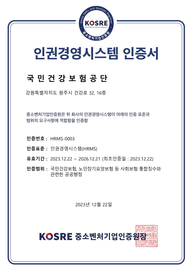중소벤처기업인증원(KOSRE)은 국민건강보험공단이 22일 인권경영시스템 인증을 신규로 취득했다고 밝혔다.