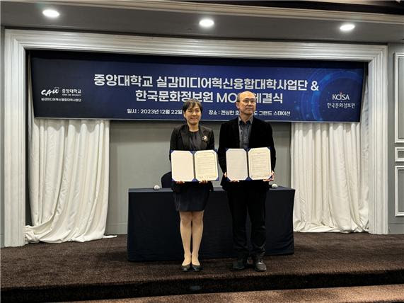 중앙대는 실감미디어혁신융합대학사업단(이하 실감미디어사업단)과 한국문화정보원의 MOU(업무협약) 체결식이 22일 여의도 켄싱턴호텔에서 진행됐다고 26일 밝혔다.