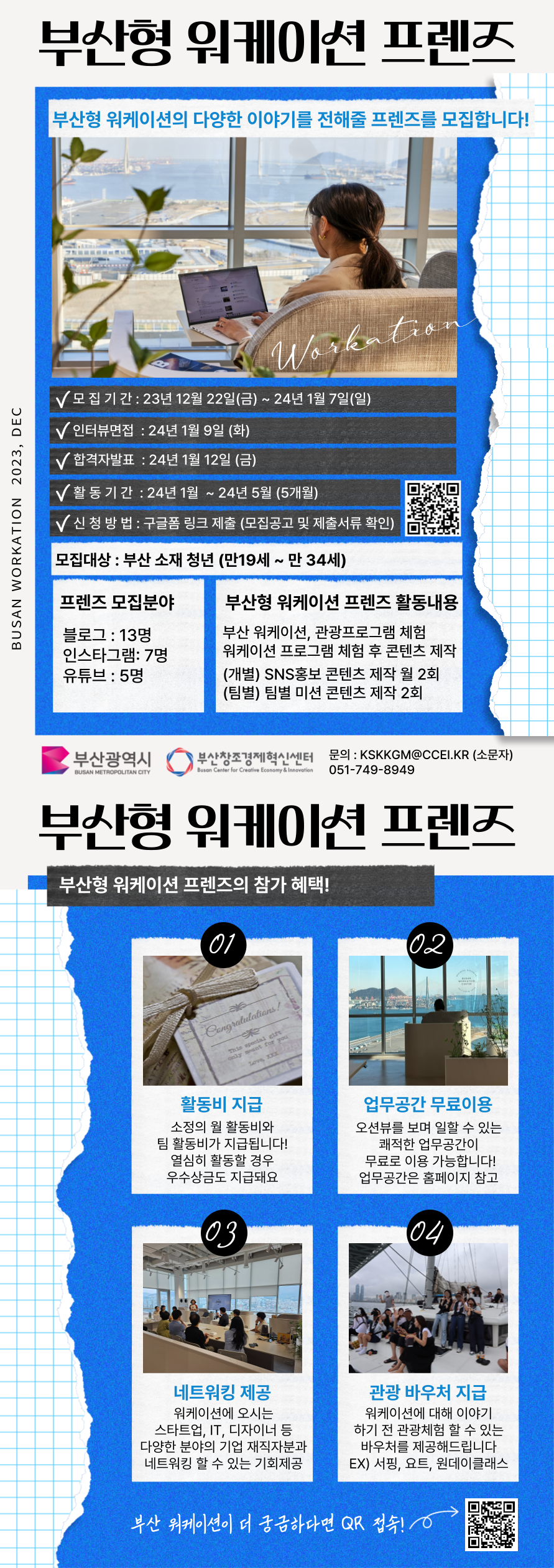 부산창조경제혁신센터(이하 부산창경)가 부산형 워케이션 활성화를 위해 5개월 간 활동할 ‘부산형 워케이션 프렌즈’를 24년 1월 7일까지 모집한다.