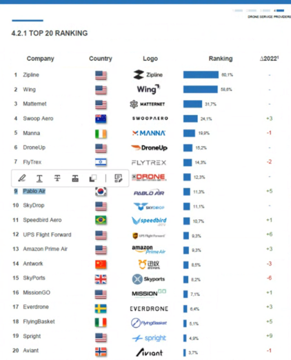 파블로항공은 전년도 14위에서 5계단 상승한 9위를 기록하며 아시아 기업 중 가장 높은 순위를 차지했다. 이는 드론배송 분야에서 기술력과 노하우를 인정받은 결과로 평가된다.