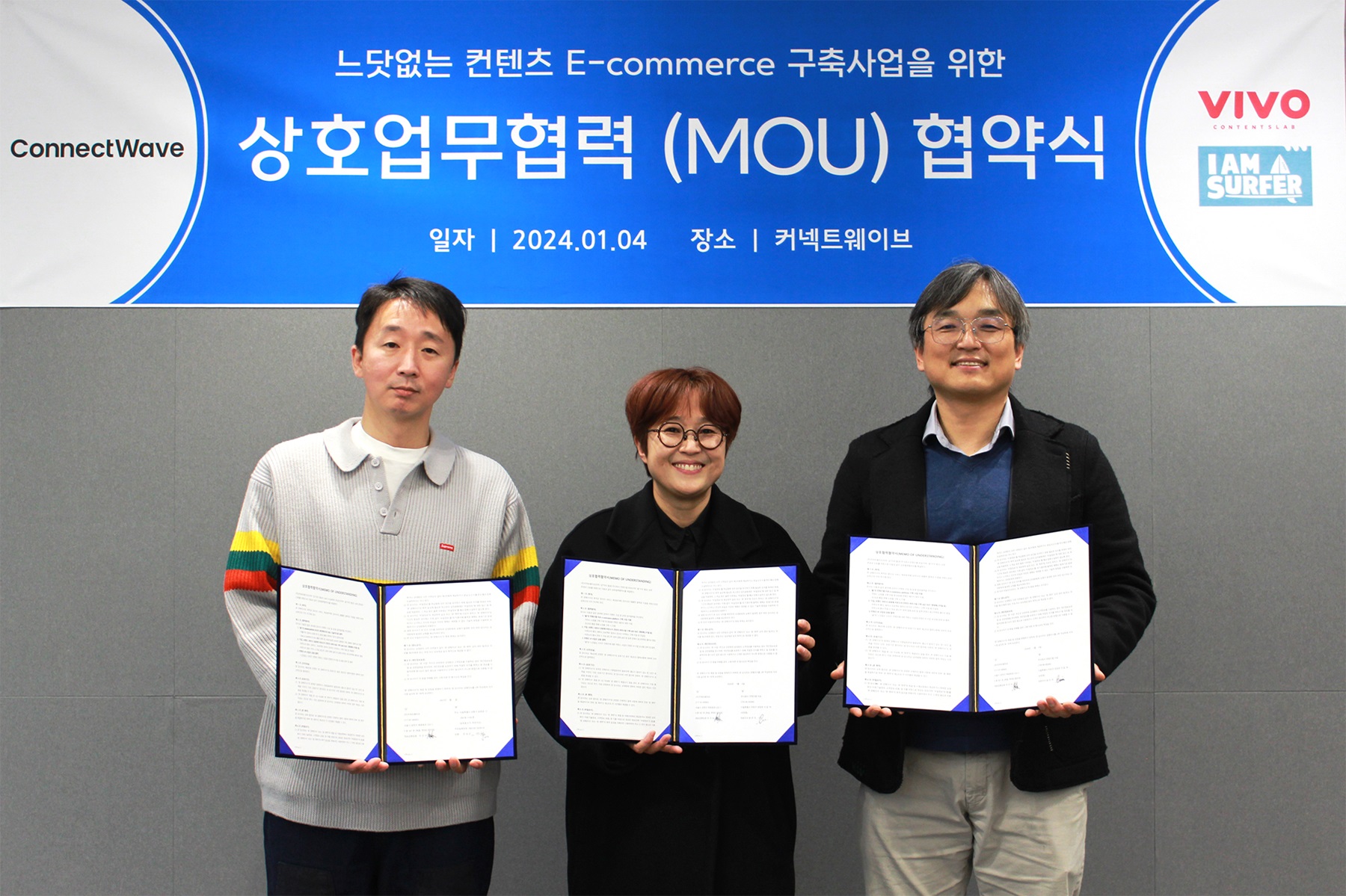 이커머스 전문기업 커넥트웨이브의 전자상거래 통합 솔루션 메이크샵이 TV예능 콘텐츠 전문기업 컨텐츠랩 비보와 이커머스 플랫폼 구축 상호업무협력(MOU) 협약식을 진행했다.