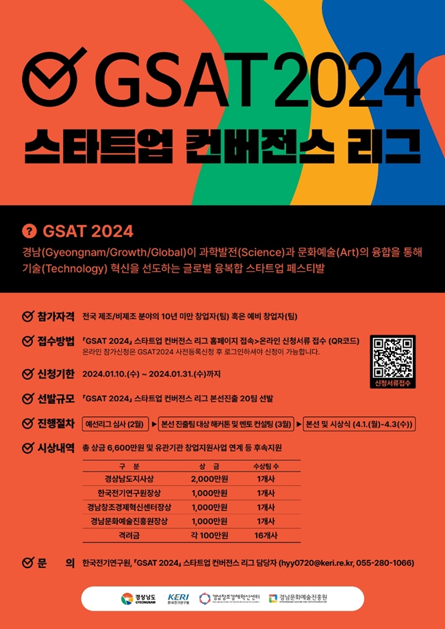 경남도는 지역 창업생태계 활성화를 위한 창업 경연대회인 ‘GSAT 2024 스타트업 컨버전스 리그’에 참여할 창업기업을 오는 10일부터 31일까지 모집한다고 밝혔다.