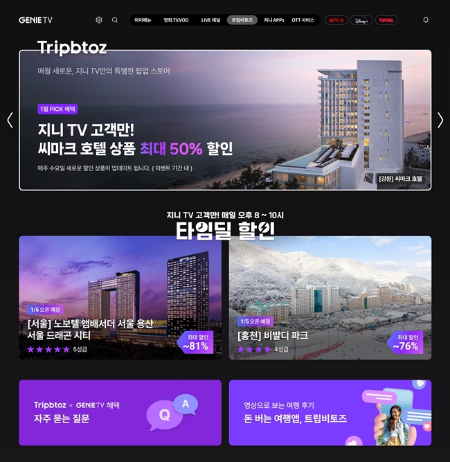 트립비토즈(Tripbtoz, 대표 정지하)는 KT(케이티) IPTV 서비스 ‘지니TV’와 협업하여 TV 시청자들에게 프리미엄 호텔 예약 혜택을 제공하는 온라인 팝업 스토어를 오픈했다고 8일 밝혔다.