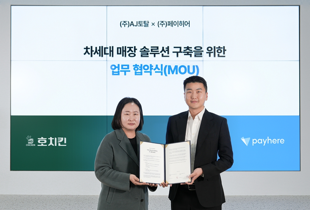 페이히어가 지난 3일, 치킨 프랜차이즈 호치킨을 운영하는 AJ토탈과 ‘차세대 매장 솔루션’ 구축을 위한 업무협약(MOU)을 체결했다.