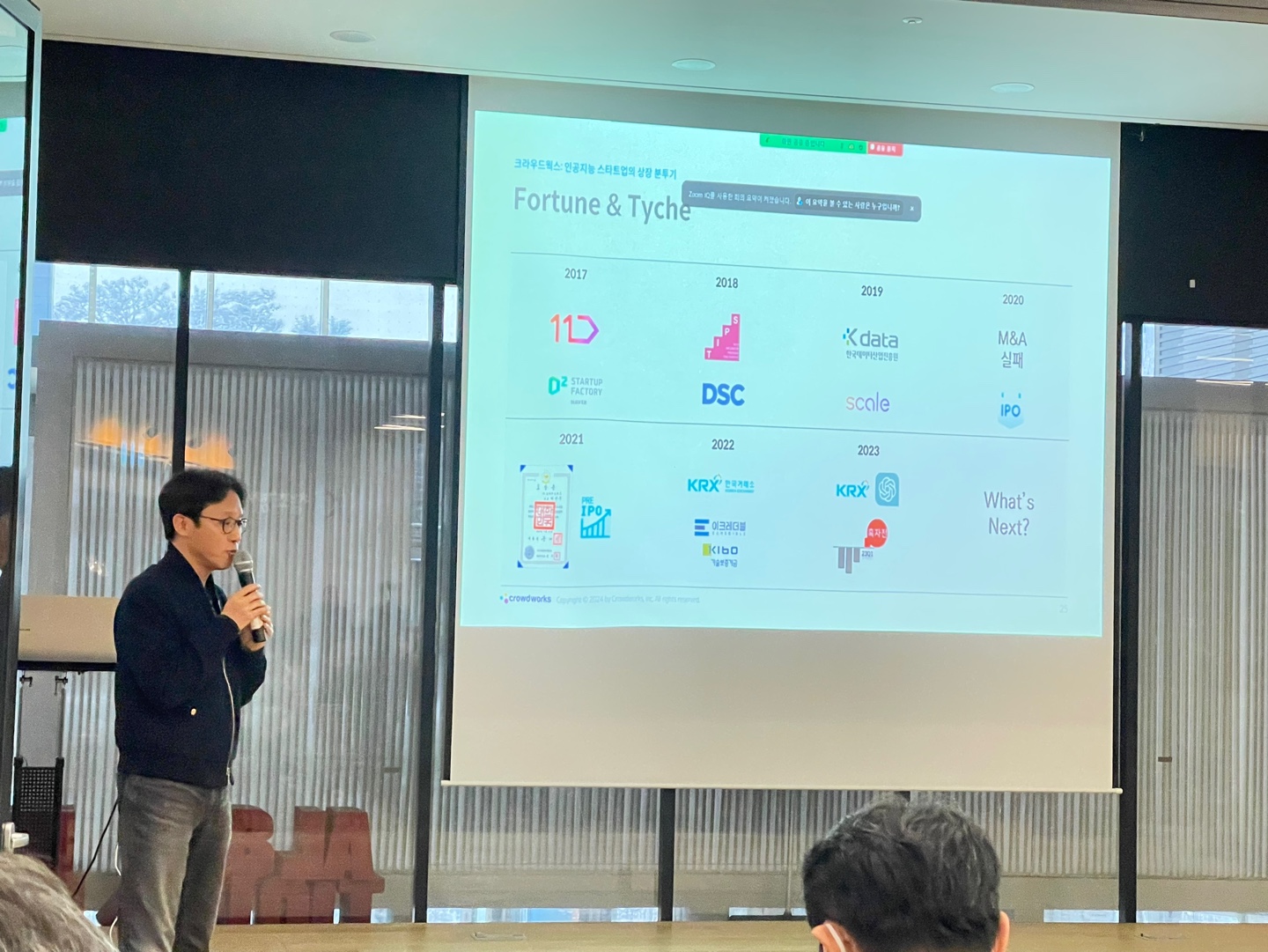 크라우드웍스 박민우 대표는 인공지능 스타트업으로서 회사 설립부터 네이버 투자까지의 과정과 힘든 시기를 극복한 사연, 그리고 챗 GPT 등장으로 회사가 상장에 이르기 까지의 고군분투했던 과정을 설명하며 “인공지능 기술은 데이터가 없으면 의미가 없다”는 것을 강조했다.