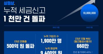 세금 신고·환급 도움 서비스 ‘삼쩜삼’을 운영하는 자비스앤빌런즈(Jobis&Villains, 대표 김범섭·정용수)가 올해 1월, 서비스 출시 3년 8개월 만에 세무 스타트업로서 누적 세금신고 1천 만 건을 돌파했다고 16일 밝혔다. 누적 세금신고 1천만 건 돌파는 전문가 영역으로만 인식된 세금 신고·환급 시장에서 AI를 활용한 100% 자동화 서비스의 성장성과 사업성을 입증한 것으로, AI·데이터 시대에 맞춰 세무시장의 혁신과 성장 방향을 제시했다는 평가를 받고 있다. ◆ 삼쩜삼 핵심 비결은 ▲독보적 기술력 ▲높은 정확도 ▲고객 편의 삼쩜삼은 AI 기술을 기반으로 세금 신고 및 환급 시나리오를 계산해 주는 서비스다. 100% 자동화로 구현한 독보적 기술력, 오차율 0.004% 미만의 높은 정확도, 개인 맞춤의 고객 편리성 등은 23년 누적 가입자 수 약 1,900만 명, 누적 환급액 9,400억 원, 2023년 연매출 500억 원이라는 기록적 성장을 만들어냈다. 또한 자비스앤빌런즈는 지난 6월 중소벤처기업부로부터 ▲사업성 ▲혁신성 ▲시장성을 인정받아 ‘예비유니콘’으로 선정된 데 이어, 7월에는 세무 스타트업 가운데서 처음으로 기술특례상장의 첫 관문인 외부 전문기관 2곳의 기술평가를 통과(A등급, BBB등급 획득)한 바 있다. ◆ 지속 성장 이끄는 세무 서비스 고도화, 고객 편리·편익의 비세무 부가서비스 자비스앤빌런즈는 AI 세무 서비스 고도화 전략을 중점 추진 중이다. 그 일환으로 작년 8월 에는 삼쩜삼 서비스의 기획, 개발, 서비스 운영을 진두지휘한 정용수 최고제품책임자(CPO)를 공동 대표로 선임한 바 있다. 여기에 세금 서비스 외에 고객의 편리와 편익에 초점을 맞춘 ▲머니가드 ▲월급찾기 ▲연말정산 미리보기 등의 신규 서비스를 추가했으며, ▲세금 가치분석 ▲소비리포트 ▲카드황금비율계산기 ▲연봉계산기 등과 같은 개별 특화서비스를 제공하는 등 앱 접근성과 편리성 제고를 강화했다. 이를 토대로 지난해 12월 한 달 동안 삼쩜삼 월간 활성 이용자수(MAU, 웹+앱)는 660만 명을 기록했다. 22년 동기간과 비교하면 40%가량 증가한 추이다. 이용자가 급증하는 종합소득세 신고 기간인 5월의 MAU가 2,000만 명인 점을 고려하면 비수기에 해당하는 12월의 MAU 증가세와 660만 명의 유입 수치는 매우 의미 있다. 그런 점에서 MAU의 상승 그래프는 삼쩜삼의 성장세를 확인할 수 있는 중요한 지표라고 할 수 있다. ◆ 2024년 ‘국민 세무 기업’ 비전 제시, 누적 가입자 수 2천만 명·누적 환급액 1조 원 달성 목표 자비스앤빌런즈 김범섭 대표는 삼쩜삼 누적 세금신고 1천만 건 돌파에 대해 “세무 스타트업이 나가야 할 방향이자 AI·데이터 시대 세무시장의 새로운 미래를 보여주는 것”이라고 평가했다. 김 대표는 “삼쩜삼을 통해 검증된 기술력, 혁신성, 사업성을 기반으로 고도화 전략을 지속 적으로 추진, 2024년에는 명실상부한 ‘국민 세무 기업’으로 도약”하겠다는 비전을 제시했다. 이와 함께 “2024년 상반기에 누적 가입자 수 2천만 명, 누적 환급액 1조 원 달성”이라는 구체적인 목표를 제시했다. 관련 기사 더 보기 https://www.venturesquare.net/905684
