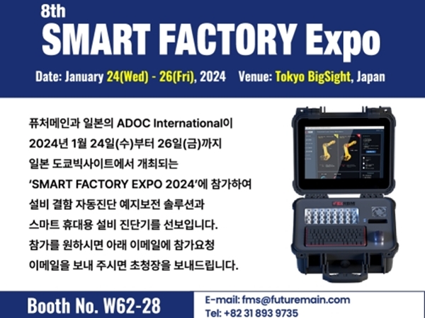 스마트팩토리 예지보전 솔루션 전문기업 퓨처메인(대표이사 이선휘)이 오는 24일부터 26일까지 도쿄 빅사이트에서 열리는 ‘스마트공장엑스포2024’에 참가한다.