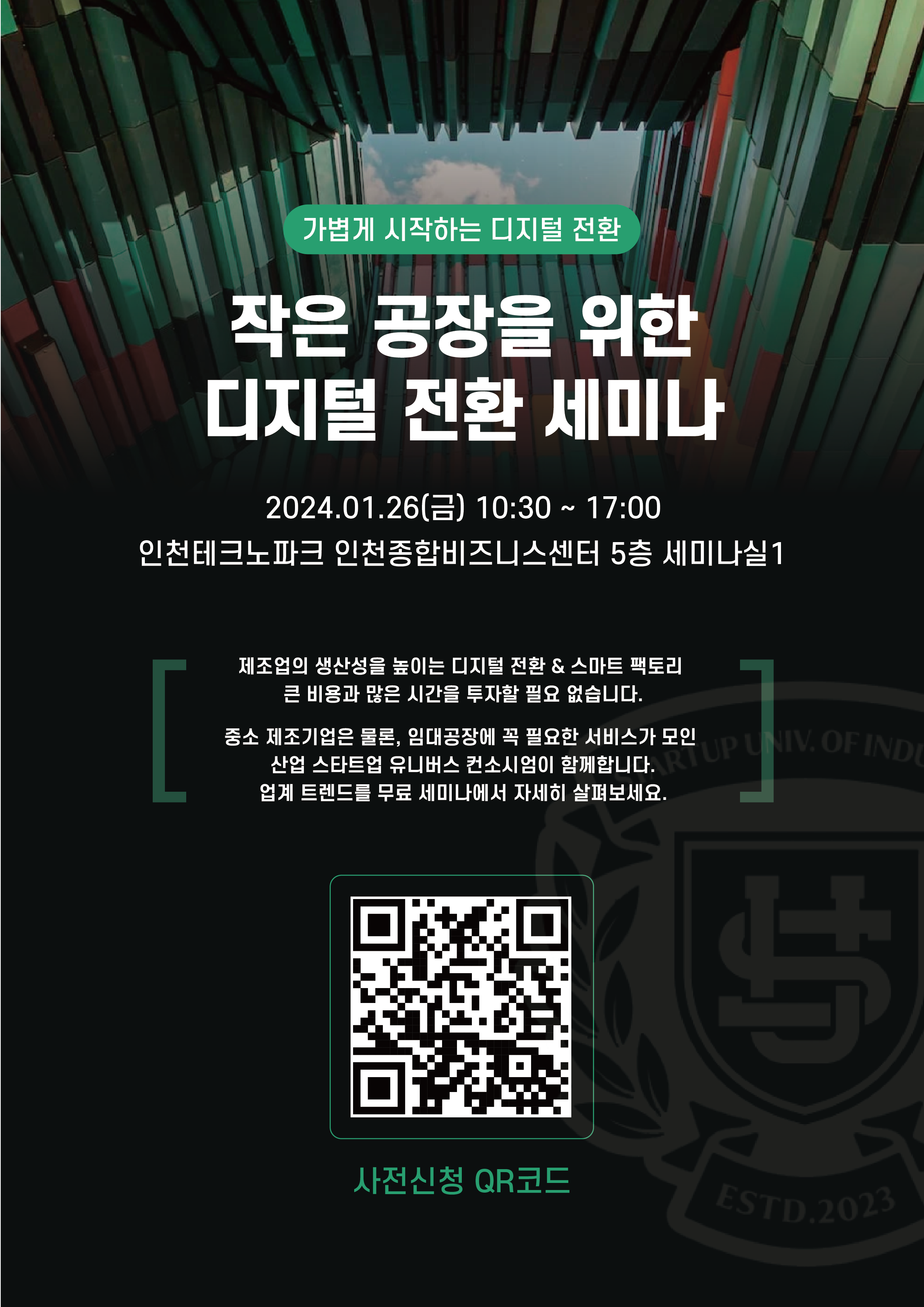 산업 스타트업 컨소시엄이 오는 26일 인천종합비즈니스센터 5층 세미나실1에서 ‘작은 공장을 위한 디지털 전환’ 무료 세미나를 개최한다.
