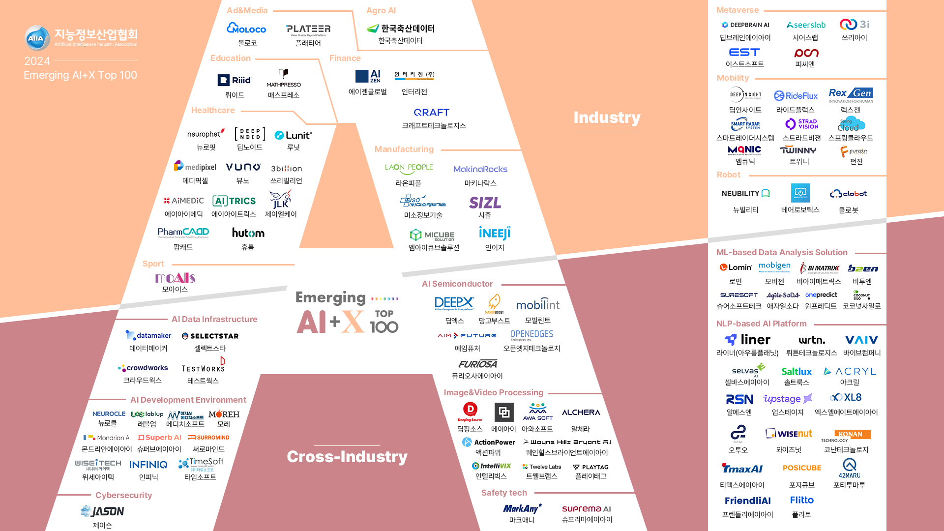 ‘Emerging AI+X Top 100’은 과학기술정보통신부 산하 지능정보산업협회 주관으로 미래가치가 더욱 기대되는 Emerging 기업으로서 AI 기술을 기반으로 다양한 산업과의 융합을 통해 미래혁신을 주도할 국내 100대 기업이다. 올해는 2,000여 개의 기업을 대상으로 산·학·연 AI 전문가들이 기업의 미래 가치, 성장성, 혁신성 등을 평가해 도메인 사업(Industry) 10개 분야 및 융합 산업(Cross-Industry) 8개 분야로 선정했다.