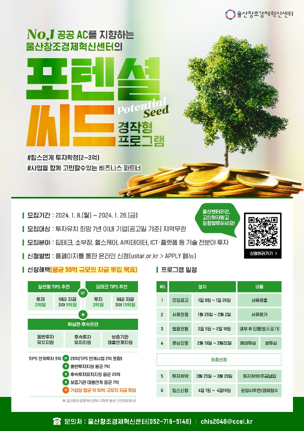 울산창조경제혁신센터(이하 울산센터)는 투자유치를 희망하는 잠재력 높은 씨앗(기업)을 발굴하여 첫 투자부터 마지막 EXIT까지 전주기 밀착 액셀러레이팅하는 ‘포텐셜 씨드’(Potential Seed) 경작형 발굴 프로그램에 참여할 스타트업을 오는 26일까지 모집한다.