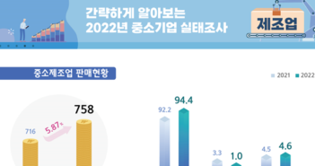 중소벤처기업부(장관 오영주)는 2022년 기준 중소기업실태조사 결과를 발표했다. 본 조사는 중소기업의 매출, 인력 등 실태전반을 파악하여 중소기업 지원 정책 수립의 기초자료로 활용하기 위해 매년 시행되고 있다. 실태조사 결과에 따르면 2022년 중소기업의 매출총액은 2,275조원으로 전년대비 272조원 증가(13.6%↑) 했다. 제조업(5.9%↑), 서비스업(17.9%↑) 모두 증가했으며, 제조업에서는 ▲음료(19.6%↑) ▲산업용기계·장비수리(13.8%↑) 순으로, 서비스업은 ▲전문, 과학·기술서비스업(34.2%↑) ▲숙박·음식점업(26.6%↑) 등에서 높은 증가세를 보였다. 한편 업체당 평균매출액은 제조업이 42.9억원으로 전년대비 0.5억원 증가 했으며, 서비스업은 26.5억원으로 2.5억원 증가한 것으로 나타났다. 중소기업의 평균 고용인원은 제조업이 전년 대비 0.6명 감소(14.7→14.1명)했고, 서비스업은 9.0명으로 전년과 동일했다. 세부 업종별로는 제조업에서 ▲의료용물질·의약품(3.7명↓) ▲인쇄·기록매체 복제업(2.1명↓) 등이 감소했으며, 서비스업은 ▲사업시설관리, 사업지원·임대서비스업(3.5명↓) ▲정보통신업(1.9명↓) 등이 감소했으나 ▲전문서비스업(2.2명↑) ▲도소매업(0.2%↑) 등은 증가했다. 중소기업의 총 투자금액은 104.8조원으로 전년대비 9.5조원 증가(10.0%↑)하였다. 설비투자(11.8%↑)와 연구개발비 투자(2.2%↑) 모두 증가하였으며, 업종별로는 제조업 7.8%, 서비스업 12.0% 증가한 것으로 나타났다. 그 외 중소기업의 평균 업력은 제조업이 13.5년(0.5년↑), 서비스업이 12.1년(0.6년↑)으로 나타났으며, 기업체 경영자의 평균 연령은 제조업 55.3세(0.5세↑), 서비스업 53.0세(0.7세↑)로 나타났다. 중소벤처기업부 박종찬 중소기업정책관은 “중소기업실태조사는 우리나라 중소기업이 중장기적으로 변화하는 모습을 파악하게 해주며, 관련 시책의 효과를 살펴보고 새로운 정책을 수립하는데 있어 중요한 참고자료”라며, “앞으로도 중소기업실태조사가 정책 현장에서 다양하게 활용될 수 있도록 지속적으로 노력하겠다”고 밝혔다. 관련 기사 더 보기 https://www.venturesquare.net/910467
