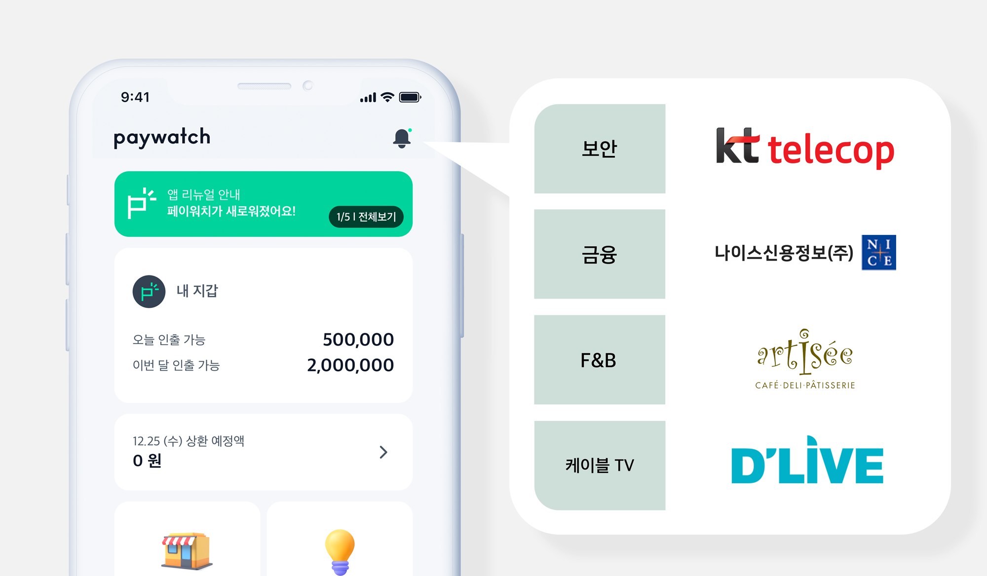 급여 선지급 서비스를 제공하는 페이워치가 KT텔레캅, 나이스그룹, 아티제, 딜라이브에 자사 서비스를 도입했다고 밝혔다.