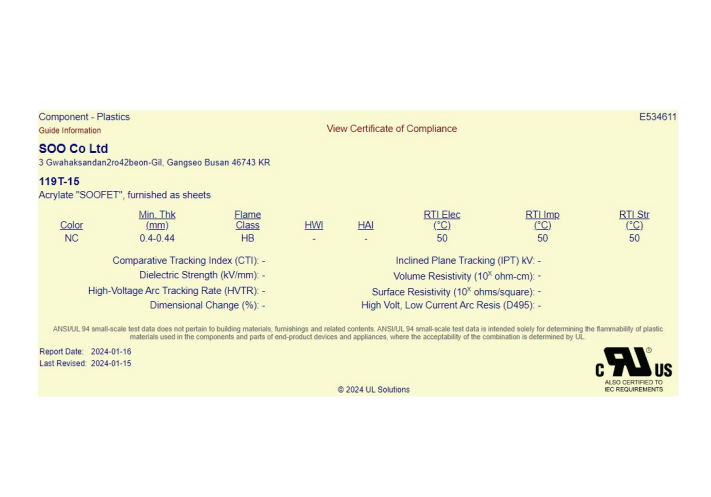 최근 ESG 경영기업으로 선정된 수가 이어, 미국 화재 안전 인증 기업 UL에서 난연성을 평가하는 항목인 UL94 인증서를 취득했다고 밝혔다.