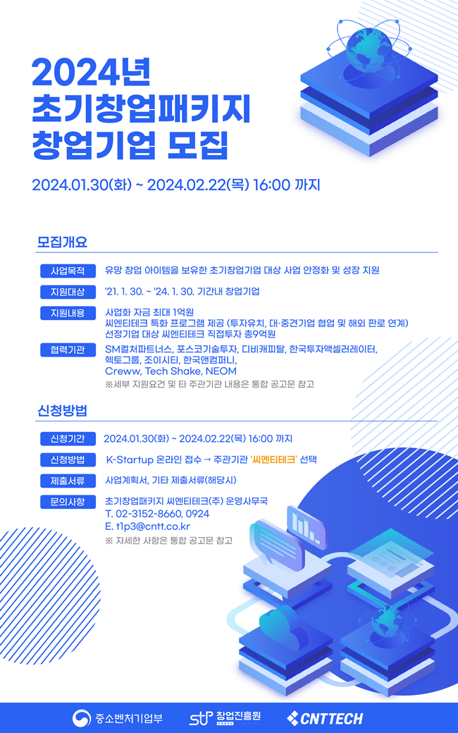 투자 전문 액셀러레이터 씨엔티테크(대표 전화성)가 ‘2024년 초기창업패키지’에 참여할 유망 초기 창업기업을 모집한다고 31일 밝혔다.