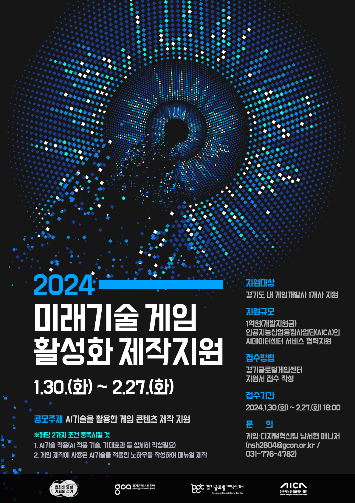 경기콘텐츠진흥원이 AI를 활용해 게임 콘텐츠를 제작하는 ‘2024 미래기술 게임 활성화 제작지원’ 사업에 참여할 게임 개발사를 2월 27일까지 모집한다.