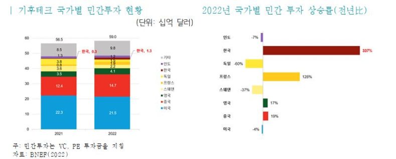 우리나라의 기후테크 산업도 규모는 작으나 빠르게 성장하고 있다. 지난 2022년 기준 한국의 기후테크 민간 투자 규모는 13억 달러로 아직 미미한 수준이나, 주요국 중 가장 높은 민간 투자 상승률(2021년 대비 337% 증가)를 보이며 투자 시장이 활성화되고 있다.