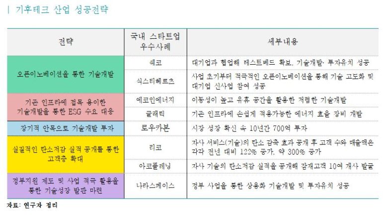 보고서는 기업이 성공적으로 기후테크 산업에 진출하기 위한 전략으로 ▲탄소 저감 실적 공개를 통한 고객층 확대 ▲기존 인프라에 접목이 용이한 기술 개발 ▲오픈 이노베이션을 통한 기술 개발 ▲장기적 안목으로 기술 개발 투자 ▲정부 지원 제도 및 사업 적극 활용을 통한 기술 성장 발판 마련을 제시한다.
