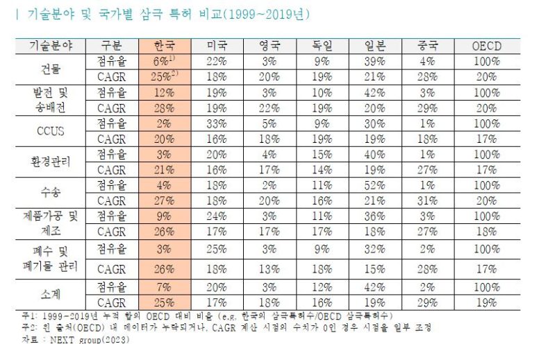 보고서는 한국의 기후테크 기술력(소계 기준)을 미국‧일본‧유럽 특허청에 모두 등록된 삼극특허(Triad Patent Families) 보유 기준으로 분석 시, 한국의 기술은 주요국 대비 높은 성장률(1999년~2021년 기준 연평균(CAGR) 25% 성장)을 보이고 있으나, 특허 보유 점유율은 7%대로 저조해 정부의 적극적인 육성 정책 마련이 시급하다고 촉구하고 있다.