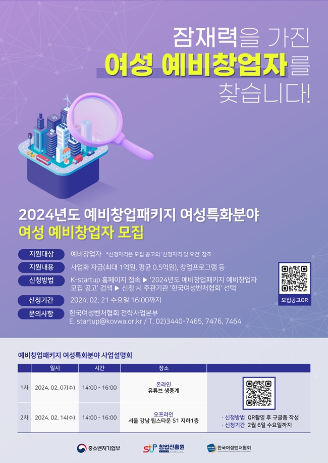 아울러 협회는 여성특화분야 지원자를 위한 사업설명회를 오는 2월 7일 오후 2시 온라인(유튜브 한국여성벤처협회 채널)에서 개최하고, 14일에는 서울 강남구 팁스타운S1에서 오프라인으로 개최한다.