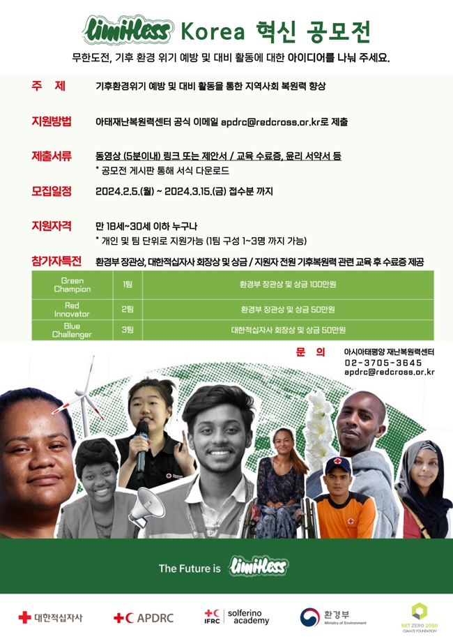 대한적십자사(회장 김철수) 아시아태평양 재난복원력센터(Asia Pacific Disaster Resilience Centre, 이하 APDRC)는 지난 5일부터 환경부(장관 한화진)와 NET ZERO 2050 기후재단(이사장 장대식)과 함께 기후환경 위기에 대한 대비 및 예방 활동을 촉진하기 위한 ‘Limitless Korea 혁신 공모전’을 개최한다.