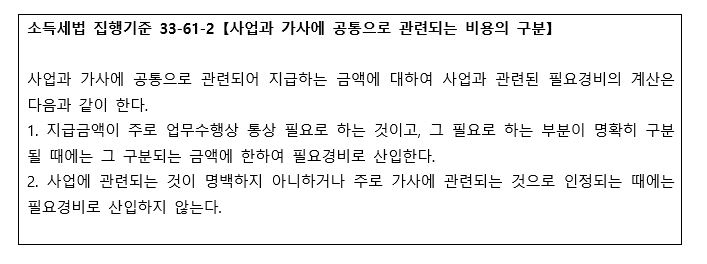 하지만 소득세법에서는 사업자가 가사와 관련하여 지출한 비용은 경비로 인정되지 않는 것으로 명시하고 있으며, 사업과 가사에 공통으로 사용한 비용에 관해서는 다음 규정과 같이 사업에 필요한 부분이 명확히 구분되는 때에 한하여 구분되는 금액을 경비로 인정토록 정하였습니다.