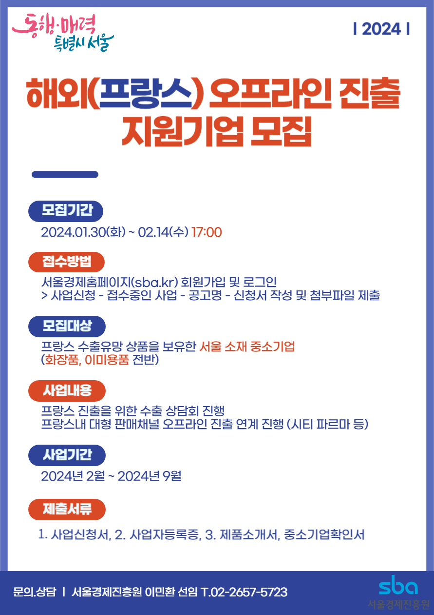 서울경제진흥원(SBA)이 2월 14일 17:00까지 중소기업 해외진출 프로그램인 ‘해외(프랑스) 오프라인 진출 지원사업’의 참가기업을 모집한다.