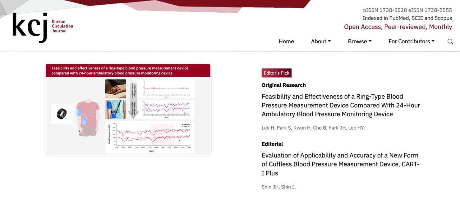 대한심장학회에서 지난 12월 대한심장학회지(KCJ)에 게재된 ‘카트 비피와 24시간 활동혈압 측정기 간 비교 연구’ 결과를 2월 대표 논문으로 선정했다.
