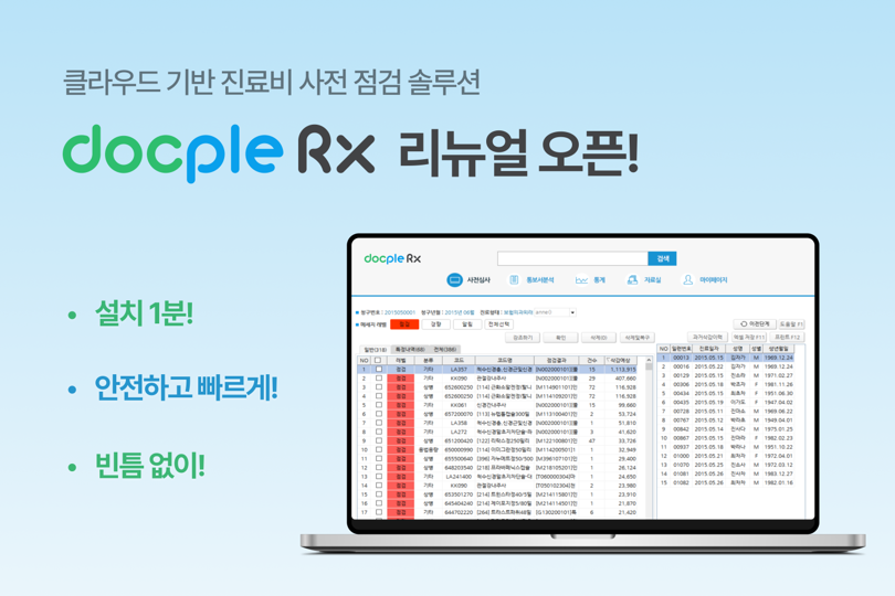 ‘닥플Rx’는 진료비 청구 시 미처 발견하지 못한 삭감 요소를 사전에 확인해 원활하고 효율적으로 병원을 경영할 수 있도록 지원한다. 리뉴얼된 ‘닥플Rx’는 클라우드 기술을 적용해 데이터 안정성과 보안 기능을 한층 강화했다. 진료 데이터가 로컬 PC가 아닌 클라우드에 저장되기 때문에 PC 기기가 손상됐을 시에도 데이터 손실 가능성이 크게 줄어들었다.