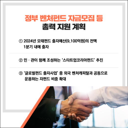 첫 번째, 2024년 중소벤처기업부 모태펀드 출자예산(9,100억원)의 전액을 1분기 내에 출자하는 등 정책금융 마중물을 신속히 투입한다.