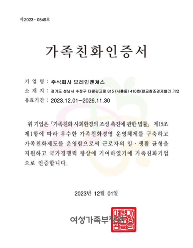 인공지능 자연어처리 전문 벤처기업 ‘브레인벤쳐스’가 여성가족부가 주관하는 ‘가족친화인증’을 신규 획득했다고 21일 밝혔다.