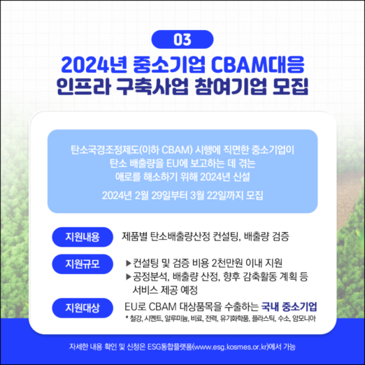 중소벤처기업부(장관 오영주)는 오는 29일부터 3월 22일까지 ‘2024년 중소기업 CBAM대응 인프라 구축사업’ 참여기업을 모집한다.