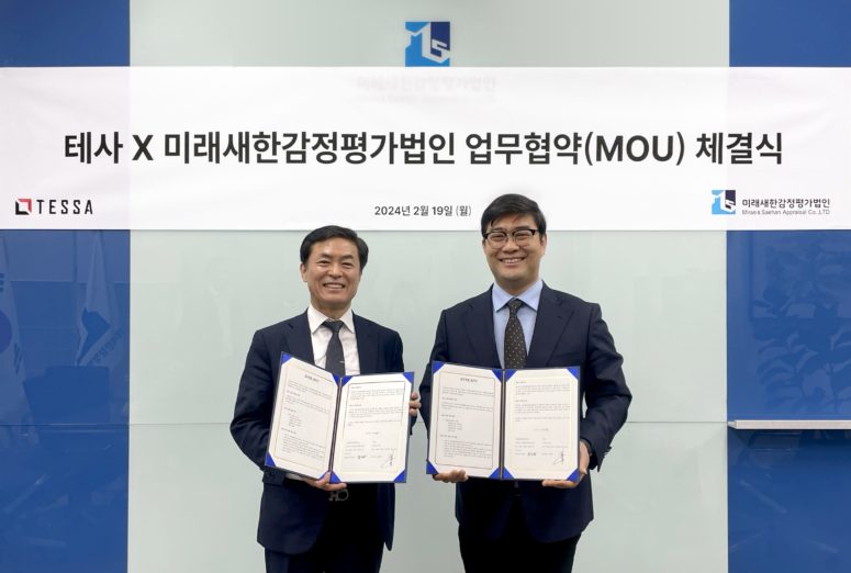 지난 19일 서울 문정동에 위치한 미래새한감정평가 본사에서 진행된 협약식에는 테사 김형준 대표와 미래새한감정평가법인 유윤상대표, 이호현 기획이사, 남세일 이사 등 양사관계자 5명이 참석했다.